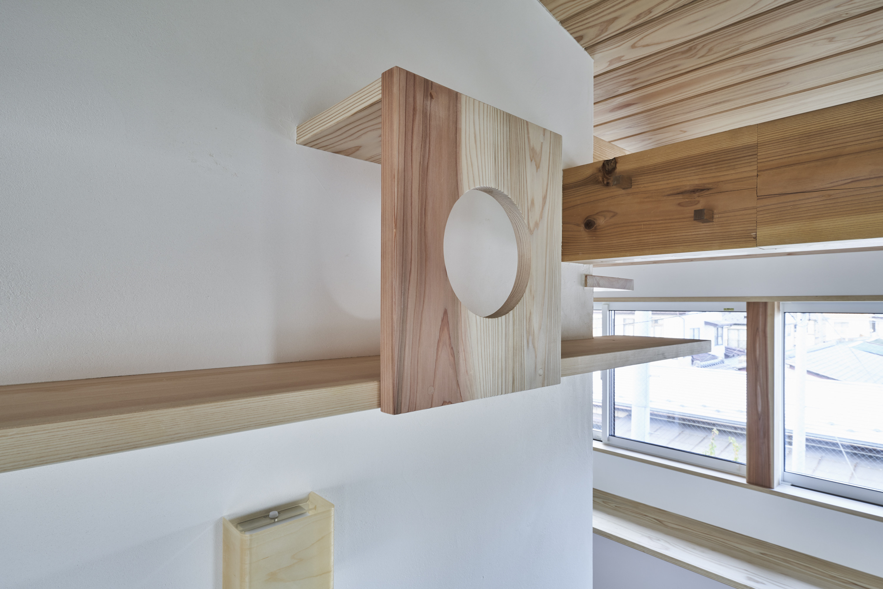 2階へあがる階段に沿うように作られた造作棚や、