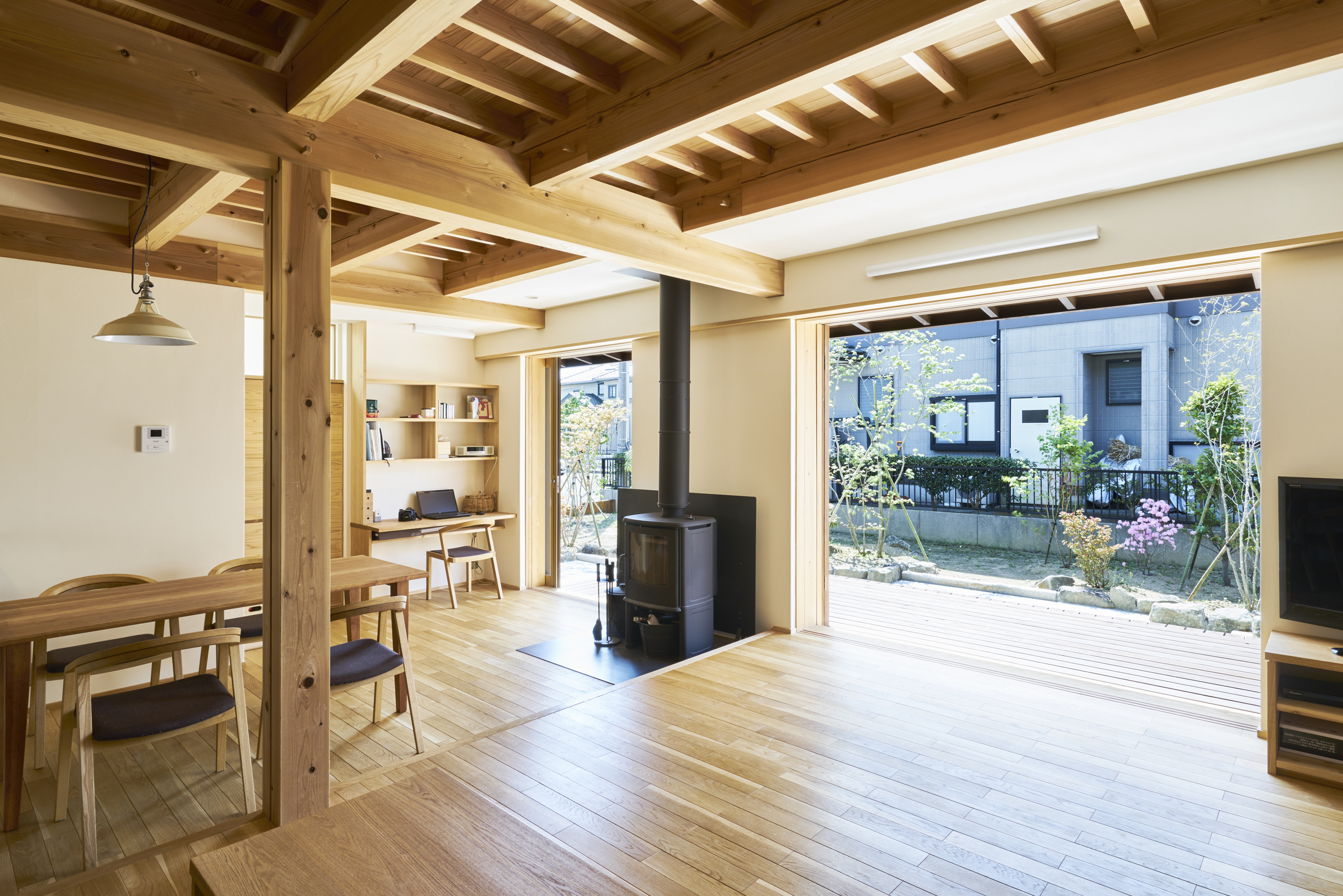 庭とリビングの間に、床とレベルを合わせたウッドデッキの中間地帯を設けました。