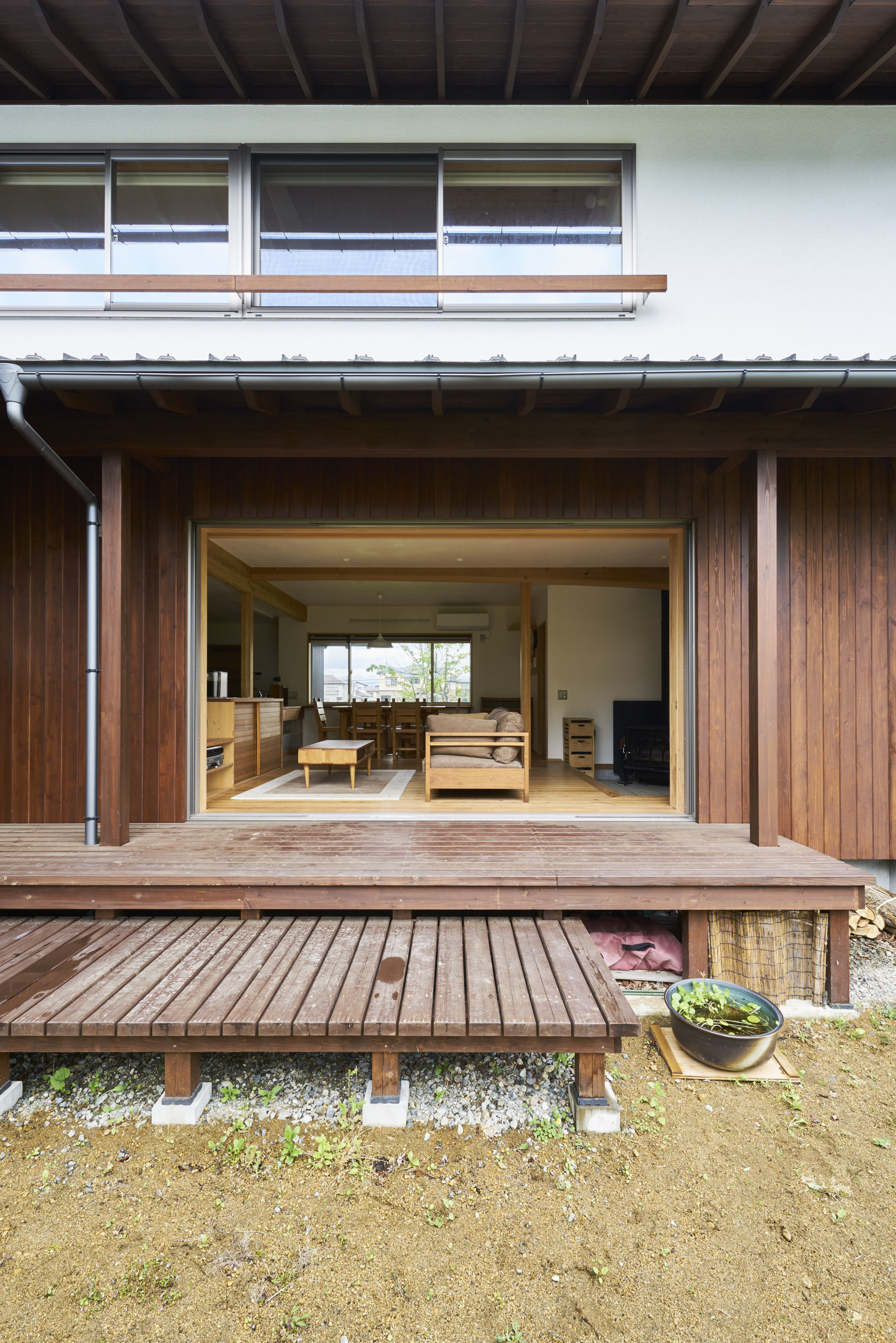 リビングを中心に、玄関から続く土間と大きなウッドデッキのレベルを合わせてつなぎ、